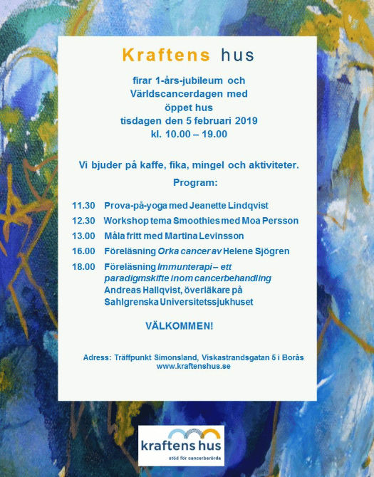 Kraftens hus firar 1-års-jubileum och Världscancerdagen med öppet hus tisdagen den 5 februari 2019 kl. 10.00 – 19.00 Vi bjuder på kaffe, fika, mingel och aktiviteter. Program: 11.30 Prova-på-yoga med Jeanette Lindqvist 12.30 Workshop tema Smoothies med Moa Persson 13.00 Måla fritt med Martina...